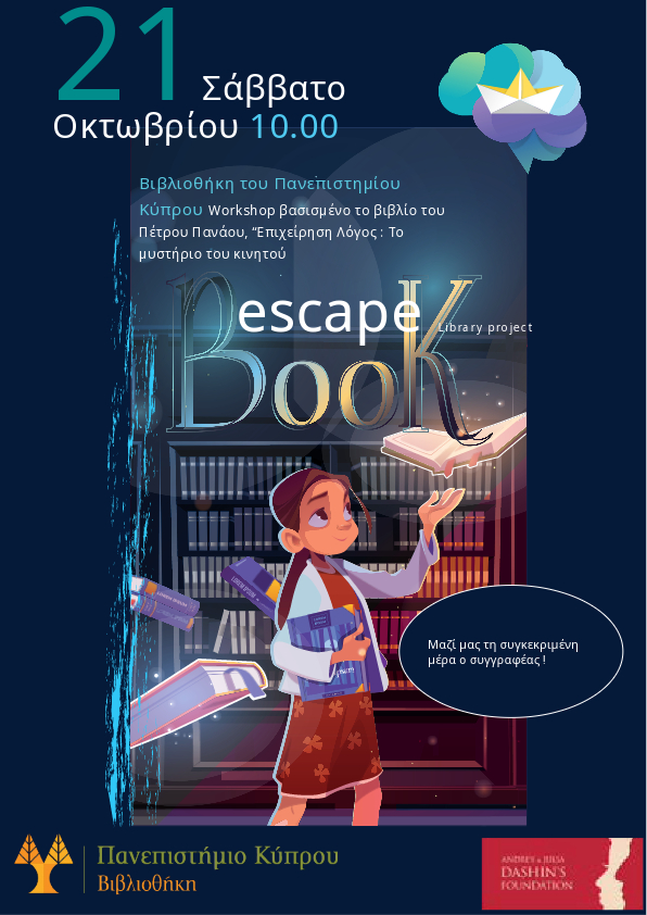 Επιχείρηση Λόγος: Το μυστήριο του κινητού. Μία περιπέτεια "μυαλού" γίνεται ένα μοναδικό "escape book project" στην Βιβλιοθήκη του Πανεπιστημίου Κύπρου, από τον Μικρό Οδυσσέα. Ελάτε μαζί μας να ...ακούσουμε, να διαβάσουμε, να μπερδευτούμε, να αναζητήσουμε, να αναρωτηθούμε, να ψαξουμε, να συνθέσουμε, να επιλέξουμε, να δημιουργήσουμε, με έμπνευση ένα μοναδικό βιβλίο.Για ηλικίες 9-12.